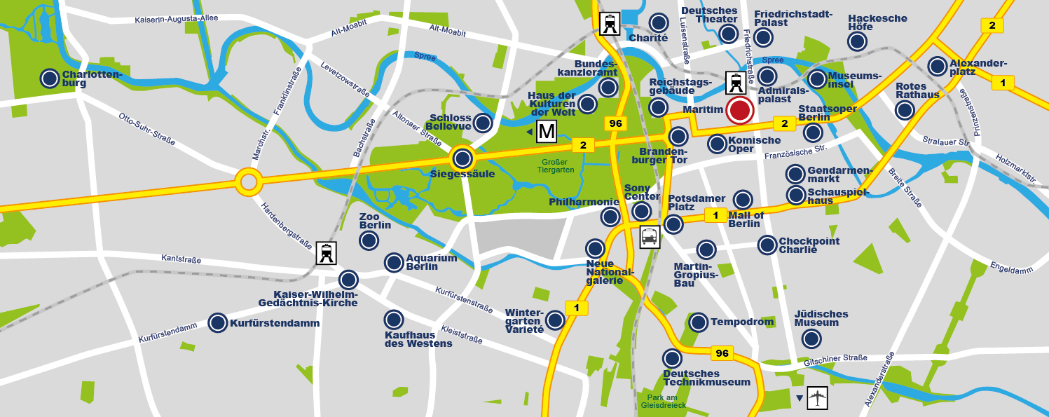 Le Maritim proArte Hotel jouit d'une situation centrale entre la porte de Brandebourg et la place Gendarmenmarkt, sur la Friedrichstrasse. L’entrée principale et l’entrée du parking souterrain se trouvent dans la rue Dorotheenstrasse. Nombre des attractions de la ville sont facilement accessibles à pied depuis l'hôtel : le théâtre Friedrichstadt-Palast, l'île des Musées, le bâtiment du Reichstag, la rue commerçante Unter den Linden, divers autres théâtres et bien plus encore.